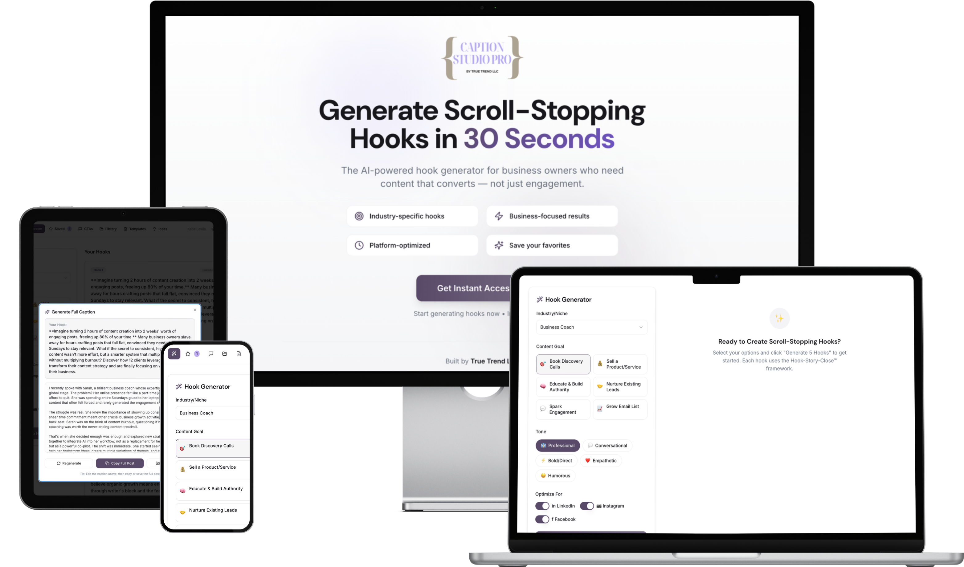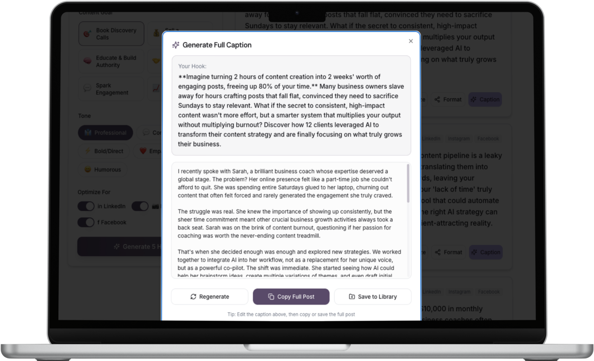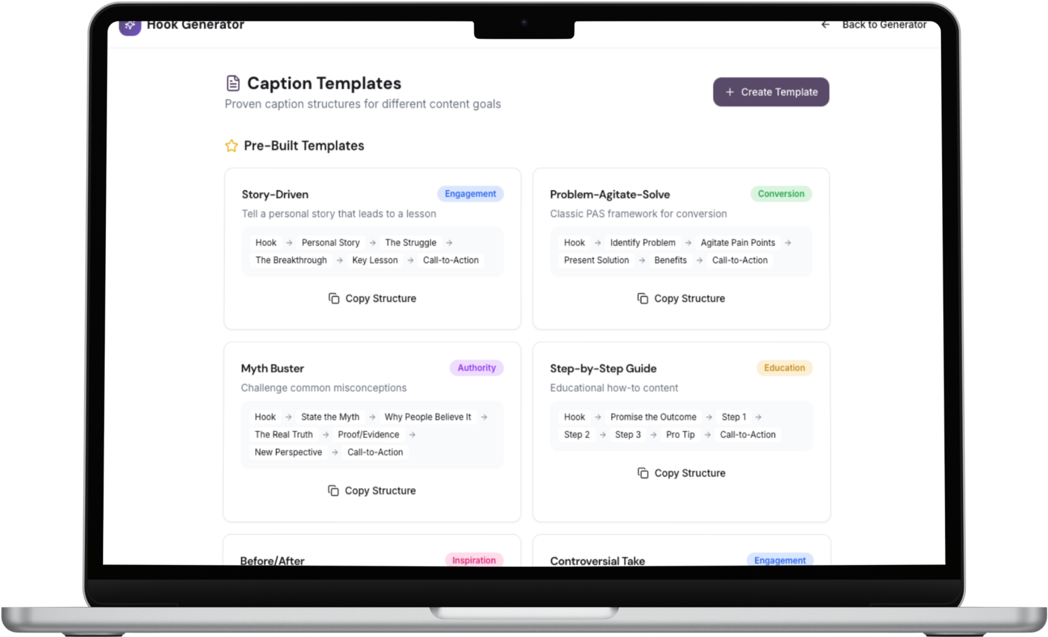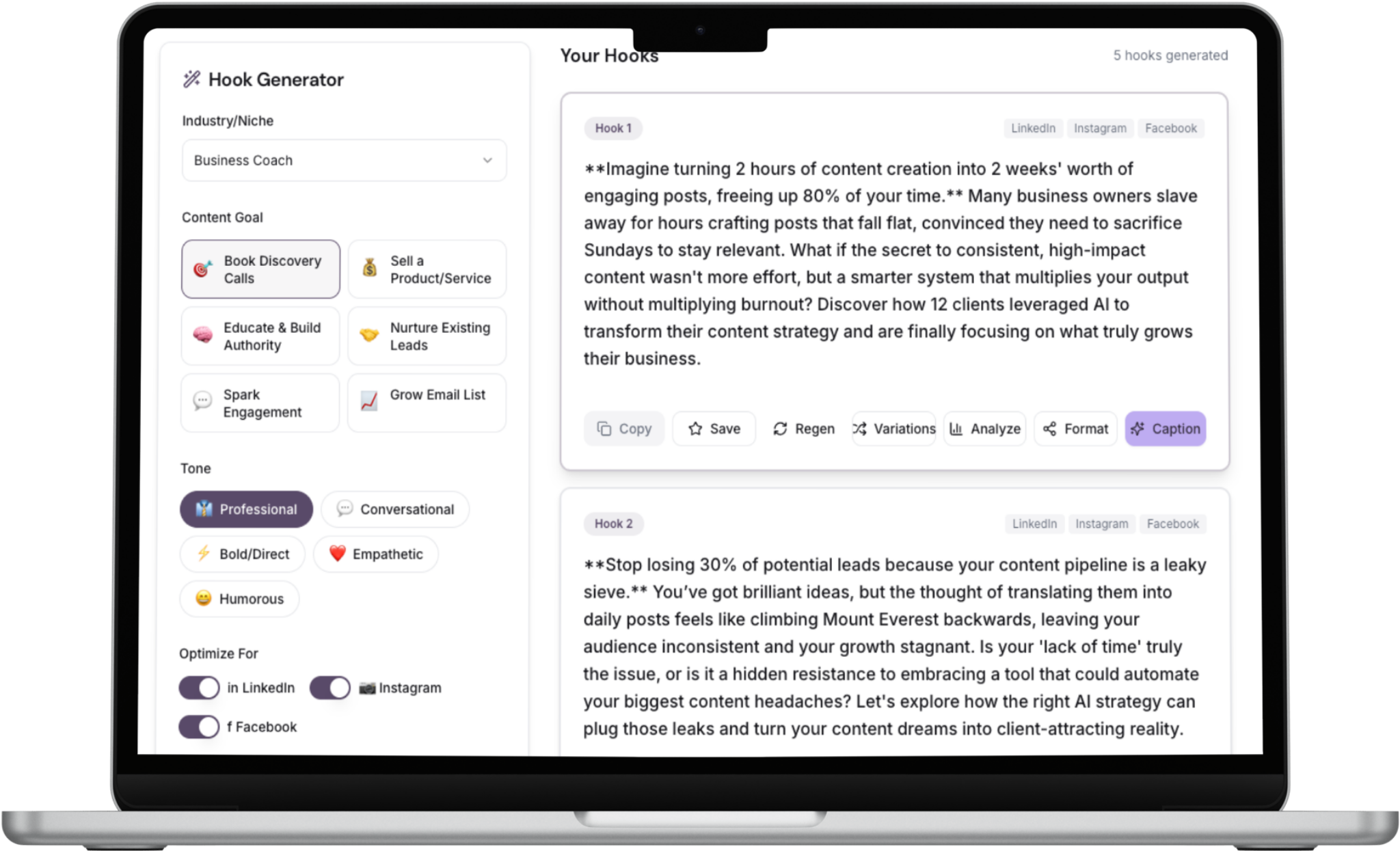 The AI-powered workspace that writes scroll-stopping hooks, trust-building stories, and conversion-focused CTAs—so you can post consistently without the caption-writing burnout.